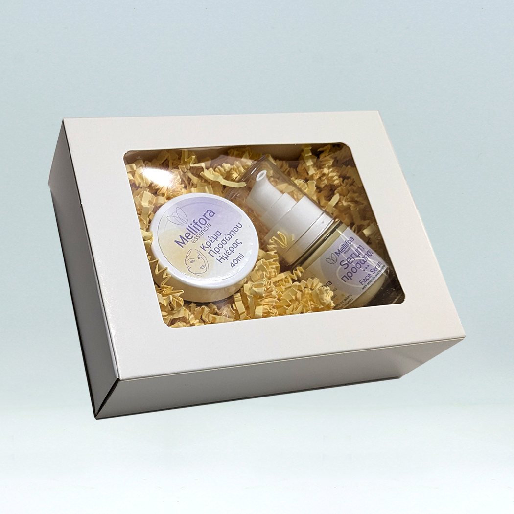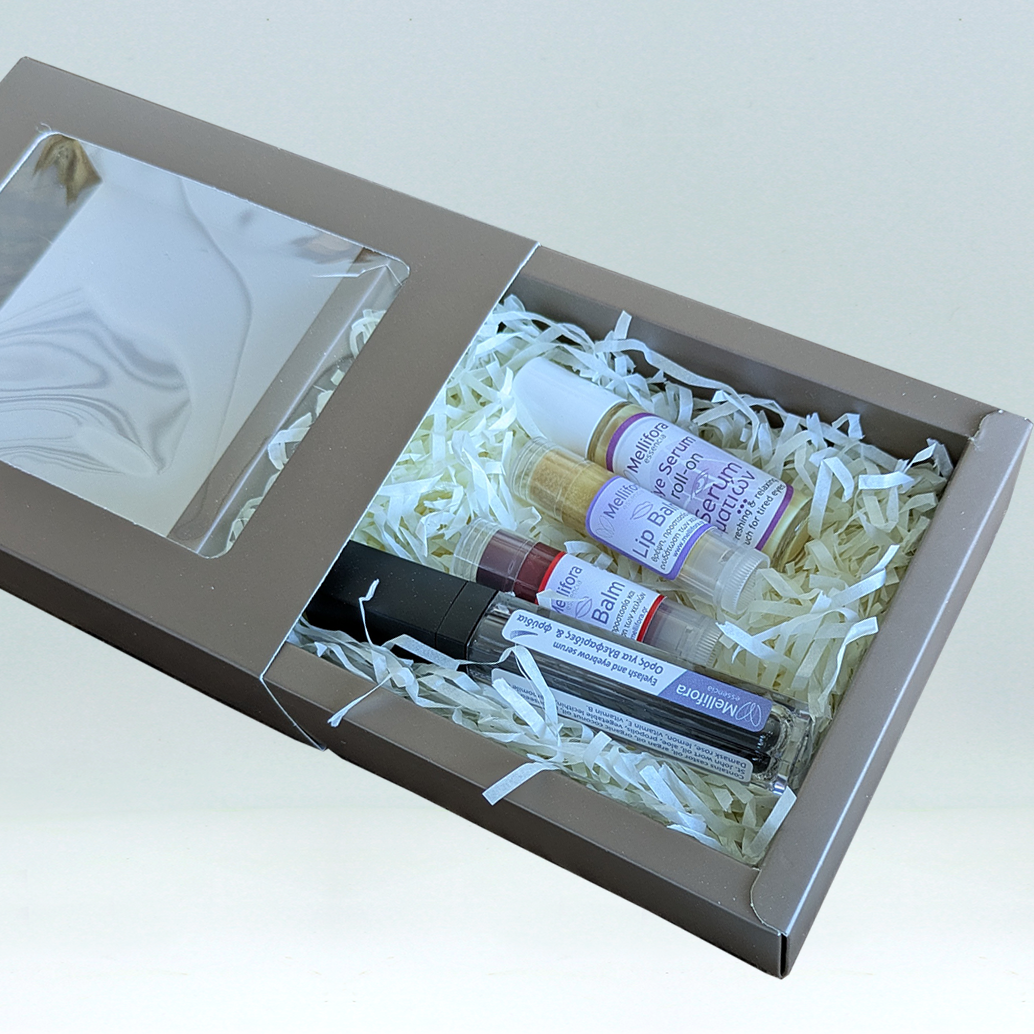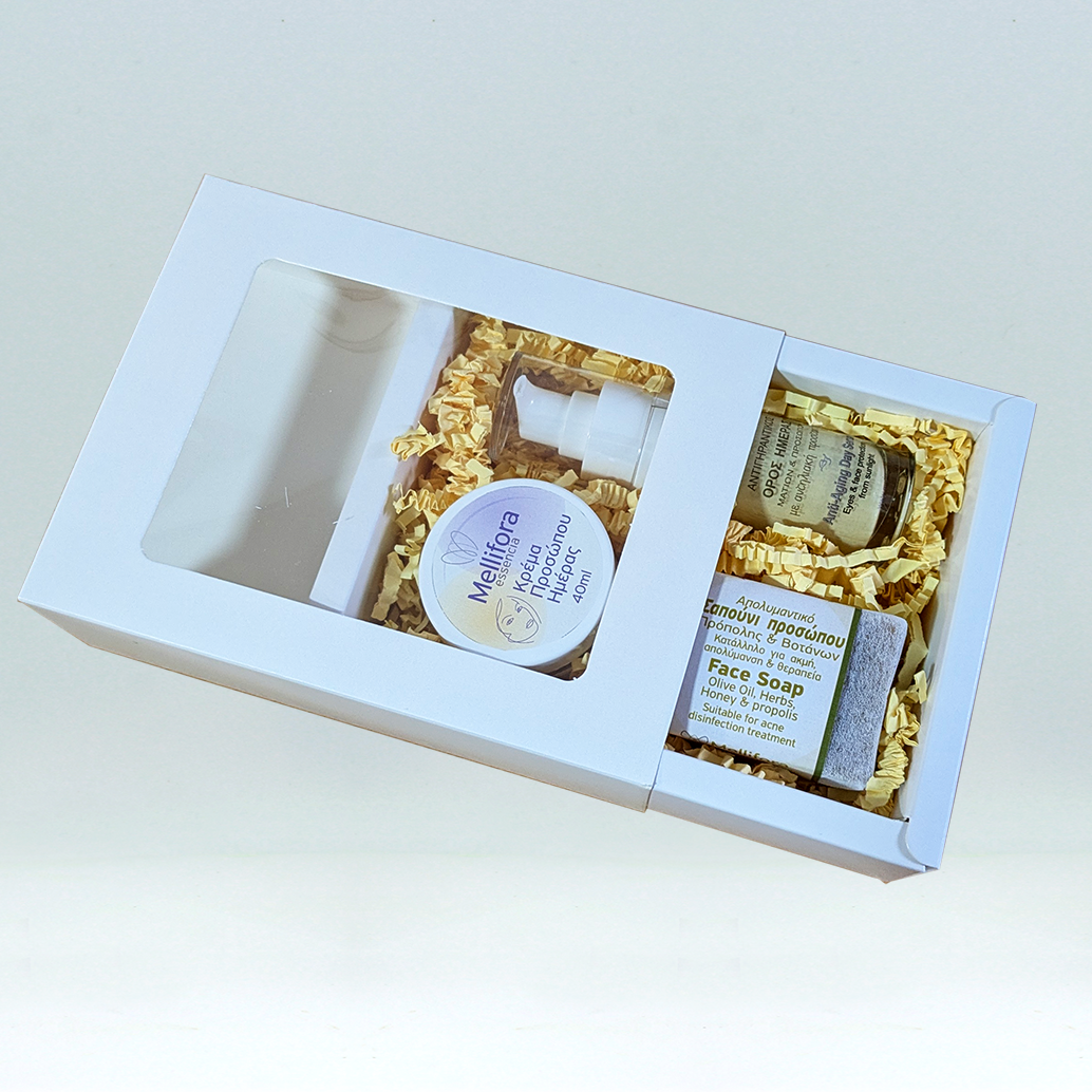 Κουτί κατάλληλο για συσκευασία δώρου (το περιεχόμενο της φωτογραφίας είναι ενδεικτικό). Χωράει 2-3 μικρές συσκευασίες. Γεμίζει με χαρτοδιογκωτικό. Εφ΄ όσον το ζητήσετε, μπορεί να τοποθετηθεί καρτελάκι με το δικό σας μήνυμα ή/και να το τυλίξουμε με εορταστικό χαρτί περιτυλίγματος και να σταλεί κατευθείαν στο αγαπημένο σας πρόσωπο. Επικοινωνήστε μαζί μας για τις λεπτομέρειες.