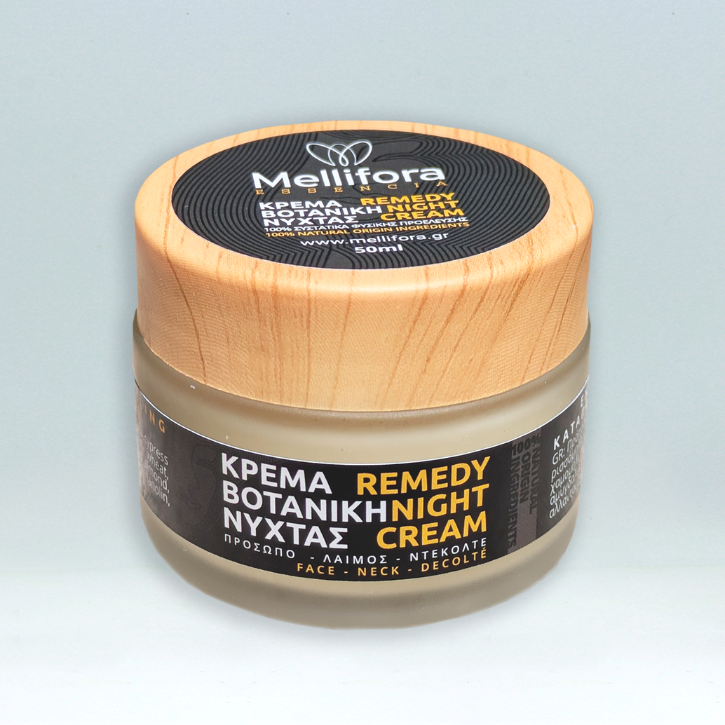 Μια πλούσια κρέμα που δρα όλη τη νύχτα, επιστρατεύοντας τα πολύτιμα θεραπευτικά βότανα του δάσους που τα συνδυάζει με τα θεραπευτικά βότανα των λουλουδιών. Πλούσια σε πρόπολη και σπαθόλαδο, η κρέμα αυτή με το λάδι των κυπαρισσόμηλων και του κισσού βοηθά στον καθαρισμό και την απολύμανση της επιδερμίδας, στην καταπολέμηση των ρυτίδων, των ραβδώσεων και των κηλίδων. Η βοτανική κρέμα νύχτας, αποτελεσματική και στην ακμή,  ενισχύεται με το σιτέλαιο που περιέχει πολλές βιταμίνες και με άλλα βότανα όπως αλόη, καλέντουλα, αβοκάντο, ελιά, αμυγδαλιά.