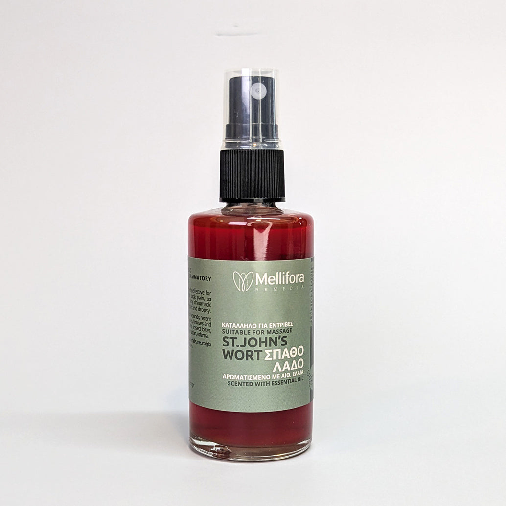 60ml κατακόκκινο εκχύλισμα σπαθόχορτου σε έξτρα παρθένο ελαιόλαδο εμπλουτισμένο με αιθέρια έλαια.